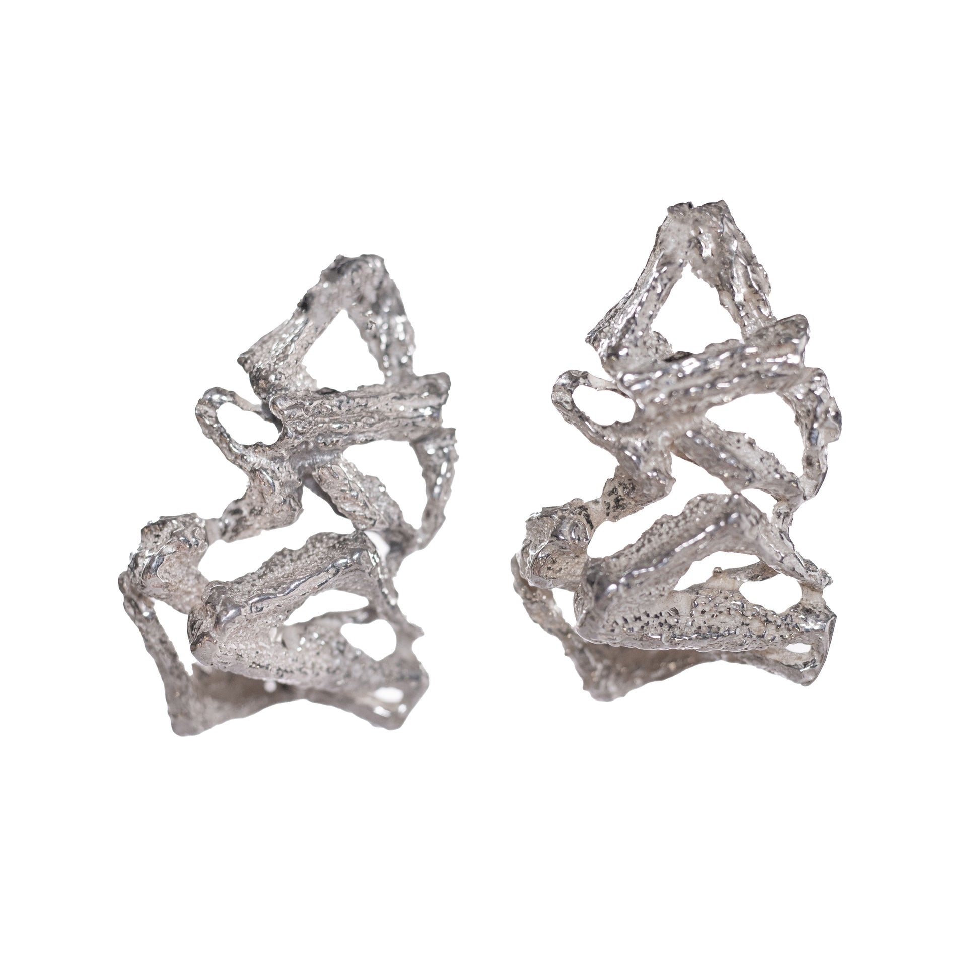Kolczyki składają się z zachodzących na siebie żabich nóg, które po zwielokrotnieniu tworzą geometryczną abstrakcję.